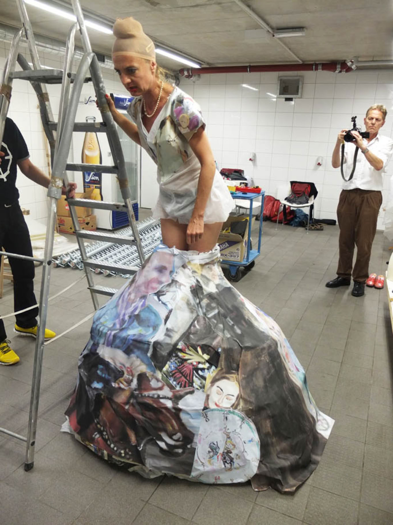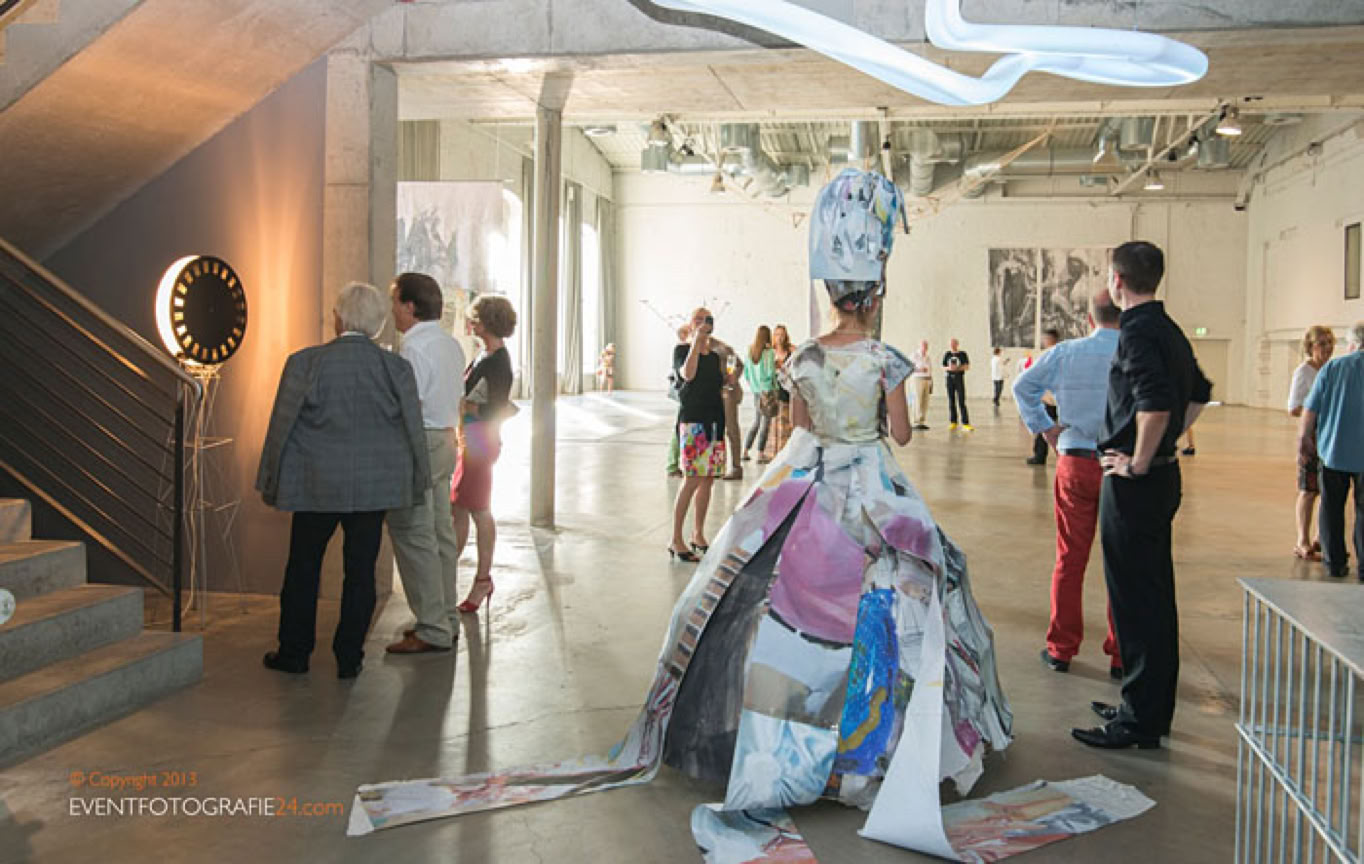 Zur Eröffnung der Ausstellung trug Marion Anna Simon ein bodenlangespapiernes Kleidund einen hohen Hut. Beide Kleidungsstückesind aus kopierten Fragmenten von Abbildungen ihrer Bilder zusammengesetzt. Die Künstlerinwandelte zwischen den ausgestellten Arbeiten umher, wobei Schülkes Beobachtungsobjekte (Observer)ihre Bewegungen aufnahmen und auf ihren Monitoren zeigten. Adrienne Elisha begleitete dieses Umherwandeln, indem sieauf ihrer Viola spielte. Besonders dann, wenn Simon vor einer künstlerischen Arbeit stehen blieb, um sie zu betrachten, entstand der Eindruck, als beschreibe Elisha mit ihrem Violaspielihre Wahrnehmung.