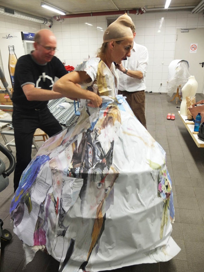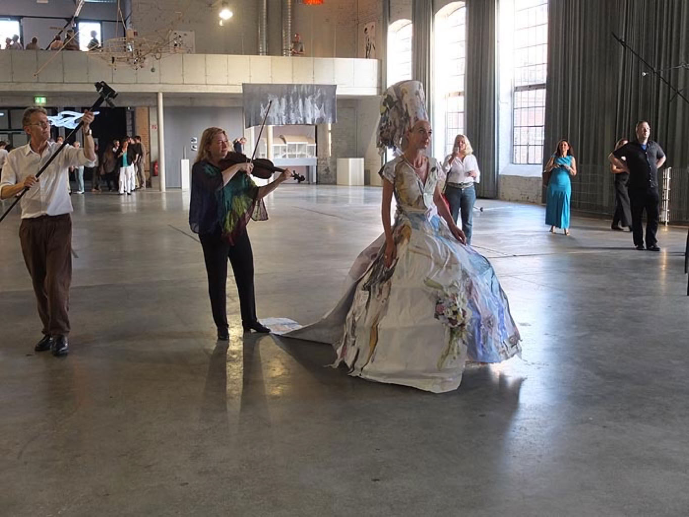 Zur Eröffnung der Ausstellung trug Marion Anna Simon ein bodenlangespapiernes Kleidund einen hohen Hut. Beide Kleidungsstückesind aus kopierten Fragmenten von Abbildungen ihrer Bilder zusammengesetzt. Die Künstlerinwandelte zwischen den ausgestellten Arbeiten umher, wobei Schülkes Beobachtungsobjekte (Observer)ihre Bewegungen aufnahmen und auf ihren Monitoren zeigten. Adrienne Elisha begleitete dieses Umherwandeln, indem sieauf ihrer Viola spielte. Besonders dann, wenn Simon vor einer künstlerischen Arbeit stehen blieb, um sie zu betrachten, entstand der Eindruck, als beschreibe Elisha mit ihrem Violaspielihre Wahrnehmung.