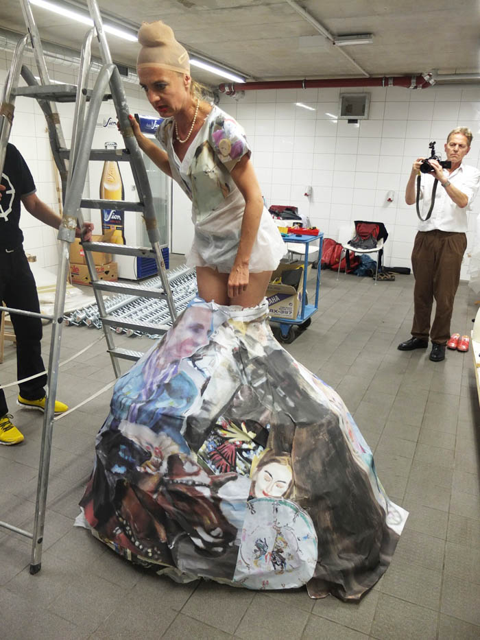Zur Eröffnung der Ausstellung trug Marion Anna Simon ein bodenlanges papiernes Kleid und einen hohen Hut. Beide Kleidungsstücke sind aus kopierten Fragmenten von Abbildungen ihrer Bilder zusammengesetzt. Die Künstlerin wandelte zwischen den ausgestellten Arbeiten umher, wobei Schülkes Beobachtungsobjekte (Observer) ihre Bewegungen aufnahmen und auf ihren Monitoren zeigten. Adrienne Elisha begleitete dieses Umherwandeln, indem sie auf ihrer Viola spielte. Besonders dann, wenn Simon vor einer künstlerischen Arbeit stehen blieb, um sie zu betrachten, entstand der Eindruck, als beschreibe Elisha mit ihrem Violaspiel ihre Wahrnehmung.
